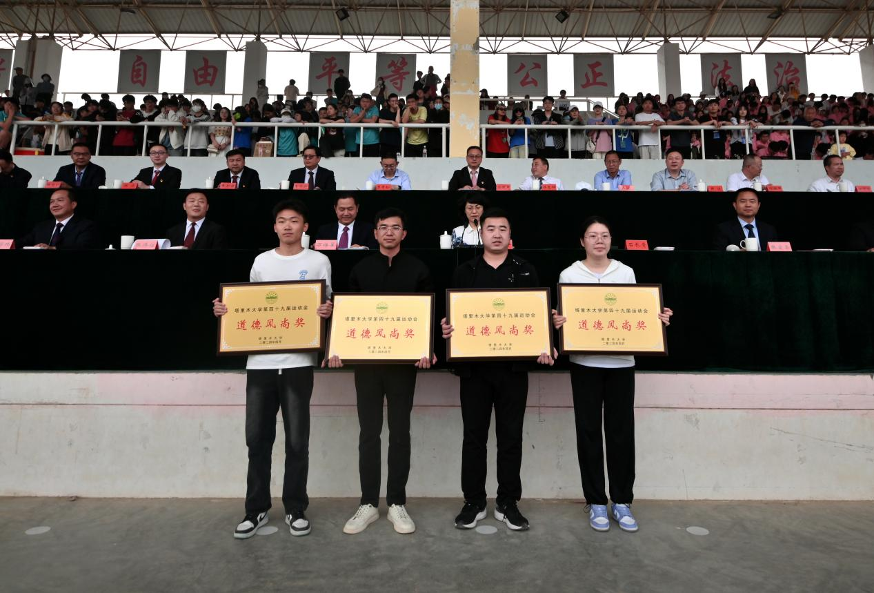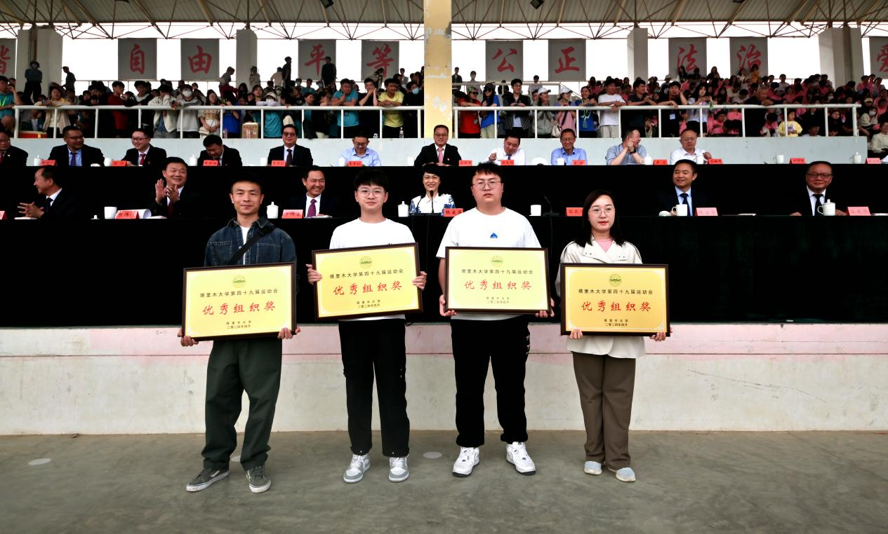 与会领导为“优秀裁判员”代表、“优秀运动员”代表、“优秀志愿者”代表、“优秀组织奖”获奖单位、“体育道德风尚奖”获奖单位、团体总分前六名单位进行了颁奖。水利与建筑工程学院、经济与管理学院、机械电气化工程学院、园艺与林学学院、农学院、人文学院分别获得团体总分第一名、第二名、第三名、第四名、第五名、第六名。